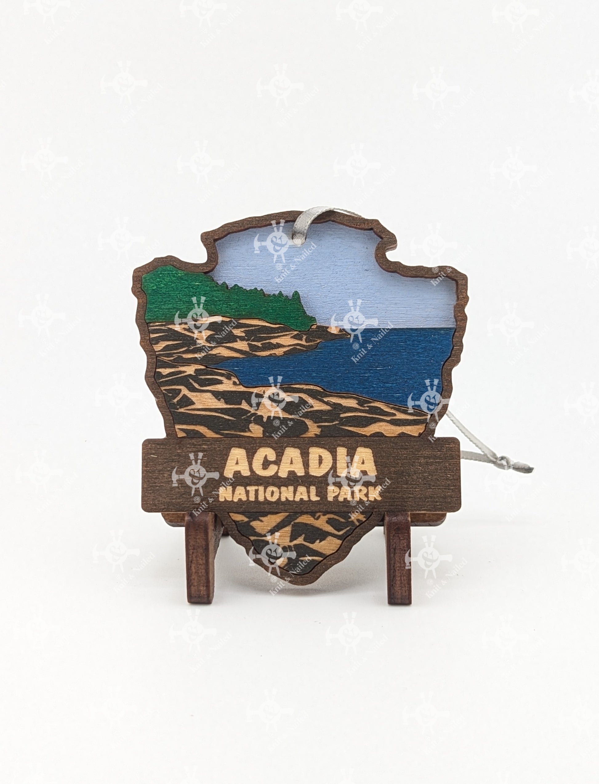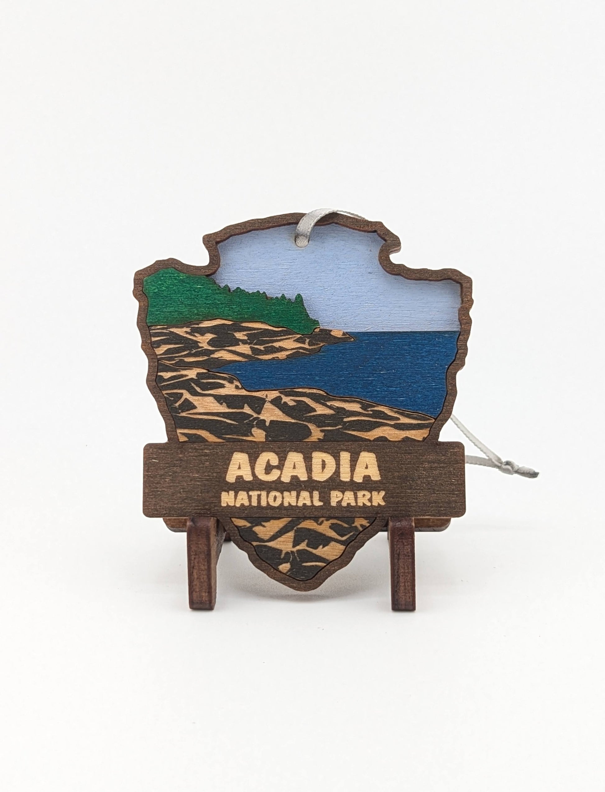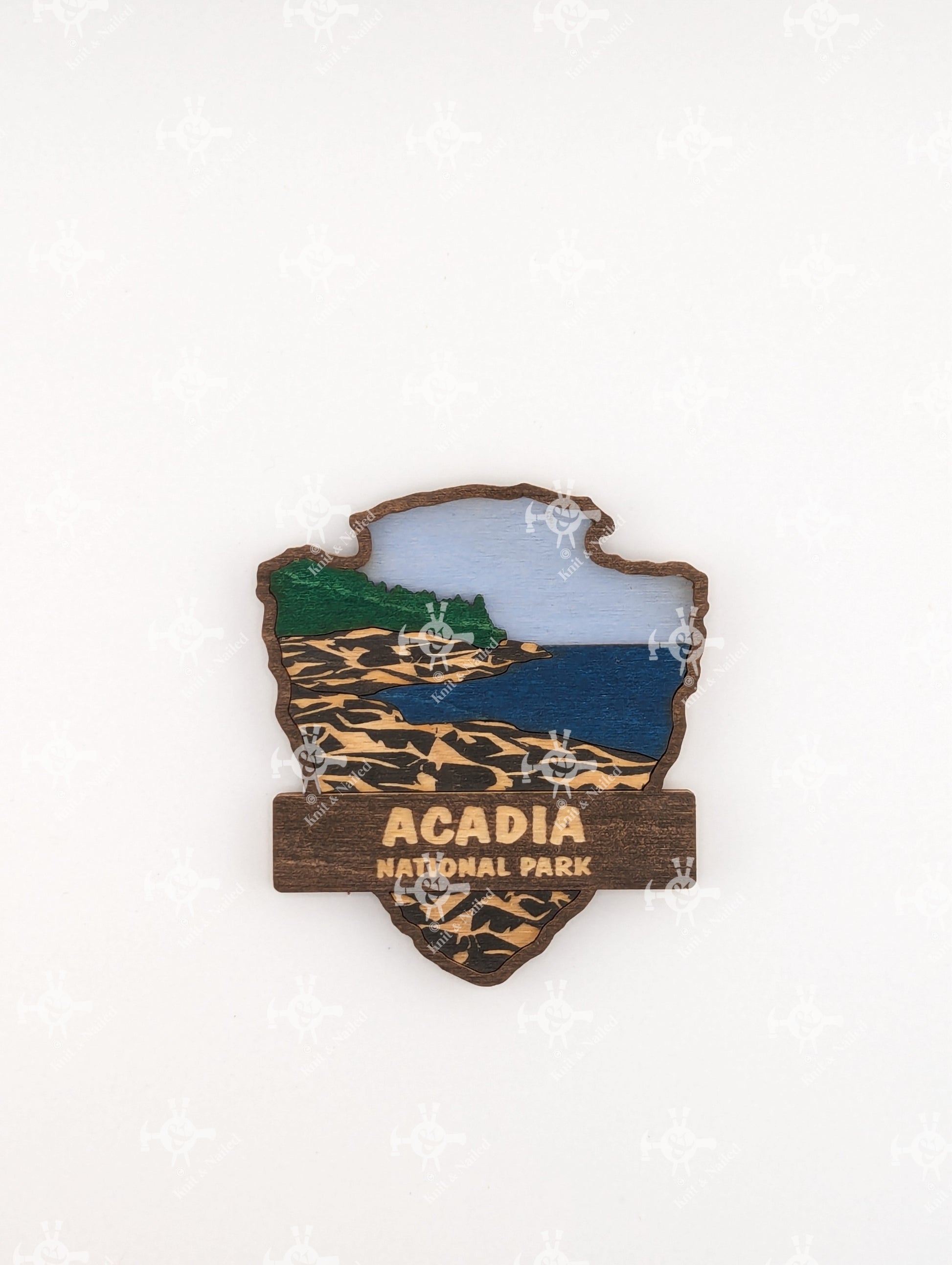 Celebrate your love for the great outdoors with this handcrafted wooden magnet or ornament. Inspired by the classic National Park Arrowhead, its layered design highlights the beauty of nature and brings a touch of the wilderness into your home. Whether displayed on your fridge or hung as décor, it makes a perfect keepsake, gift, or addition to your National Park collection. Each piece is laser-cut and hand-finished, making each item a one-of-a-kind piece of art. Created in our home. From our family to yours. Dimensions: 3.5" tall x 3" wide.
