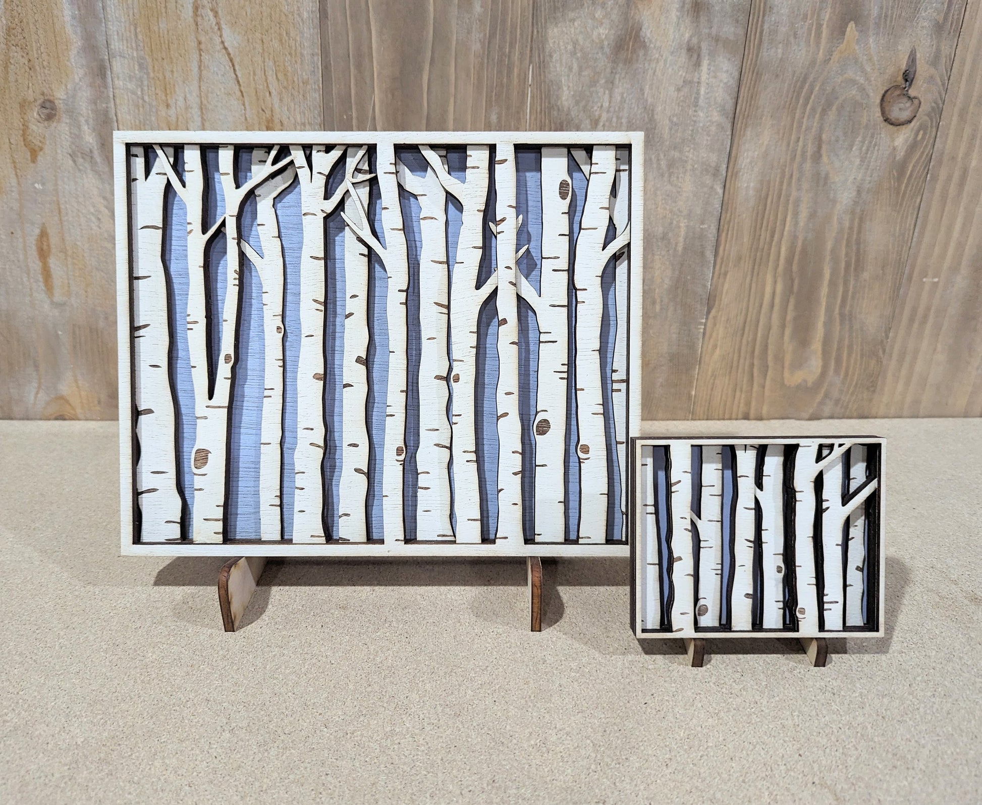 This is a perfect gift for a birch tree lover in your life! Shows multiple layers of birch trees in the forest on a blue sky background. Three dimensional artwork to adorn your wall or desk.
