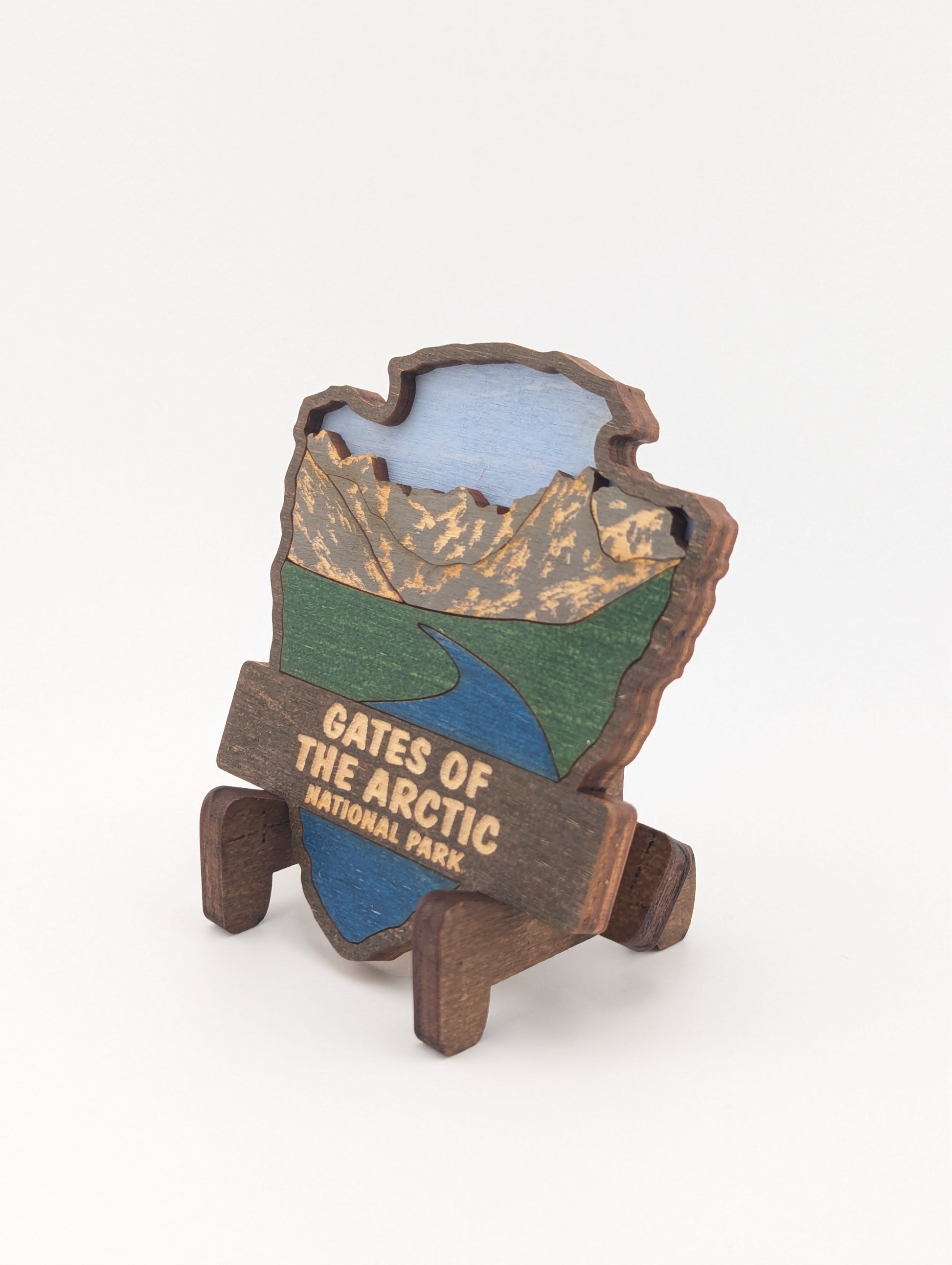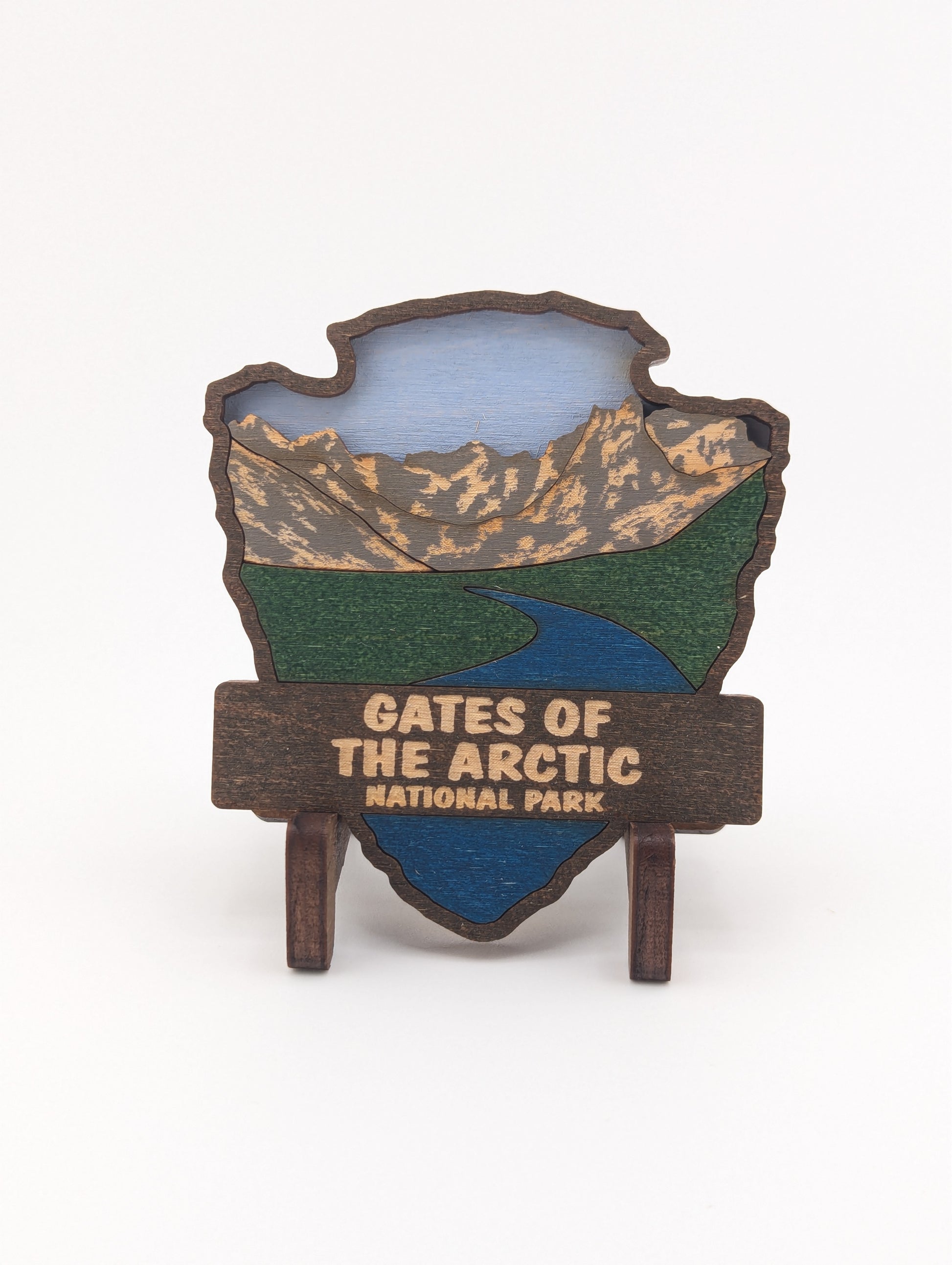 Celebrate your love for the great outdoors with this handcrafted wooden magnet or ornament. Inspired by the classic National Park Arrowhead, its layered design highlights the beauty of nature and brings a touch of the wilderness into your home. Whether displayed on your fridge or hung as décor, it makes a perfect keepsake, gift, or addition to your National Park collection. Each piece is laser-cut and hand-finished, making each item a one-of-a-kind piece of art. Created in our home. From our family to yours. Dimensions: 3.5" tall x 3" wide.