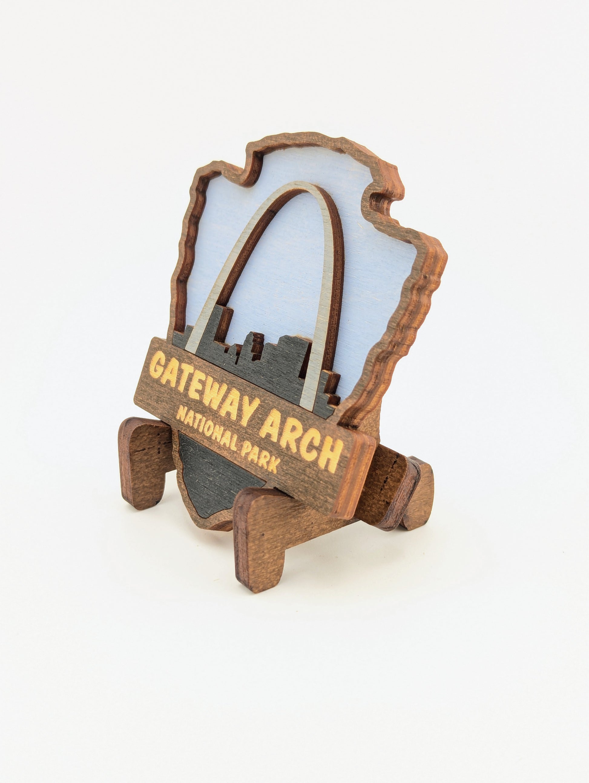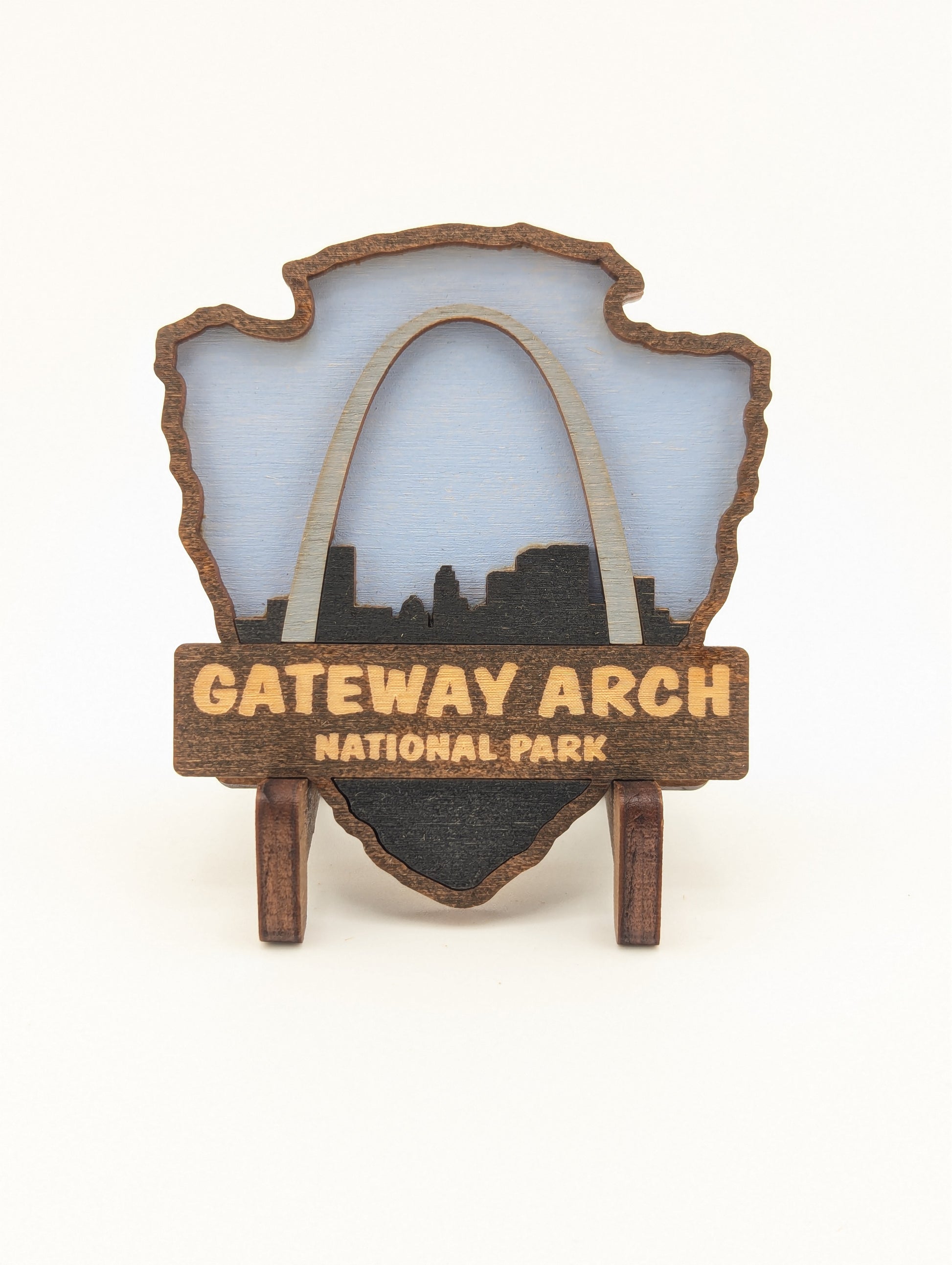 Celebrate your love for the great outdoors with this handcrafted wooden magnet or ornament. Inspired by the classic National Park Arrowhead, its layered design highlights the beauty of nature and brings a touch of the wilderness into your home. Whether displayed on your fridge or hung as décor, it makes a perfect keepsake, gift, or addition to your National Park collection. Each piece is laser-cut and hand-finished, making each item a one-of-a-kind piece of art. Created in our home. From our family to yours. Dimensions: 3.5" tall x 3" wide.