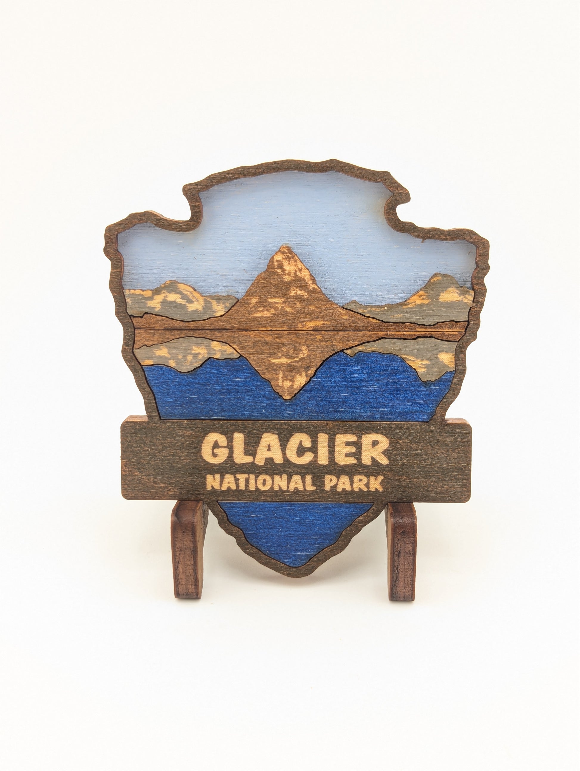 Celebrate your love for the great outdoors with this handcrafted wooden magnet or ornament. Inspired by the classic National Park Arrowhead, its layered design highlights the beauty of nature and brings a touch of the wilderness into your home. Whether displayed on your fridge or hung as décor, it makes a perfect keepsake, gift, or addition to your National Park collection. Each piece is laser-cut and hand-finished, making each item a one-of-a-kind piece of art. Created in our home. From our family to yours. Dimensions: 3.5" tall x 3" wide.
