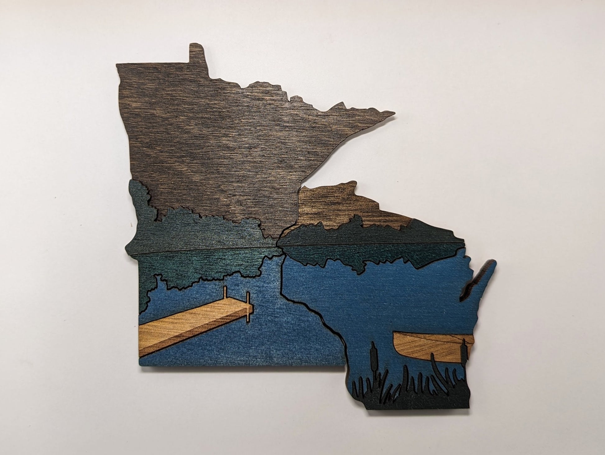 Minnesota 5" with Wisconsin that nestles magnet. Layered wood art. Multipurpose housewarming, wedding, or Christmas gift. Adorable, natural.