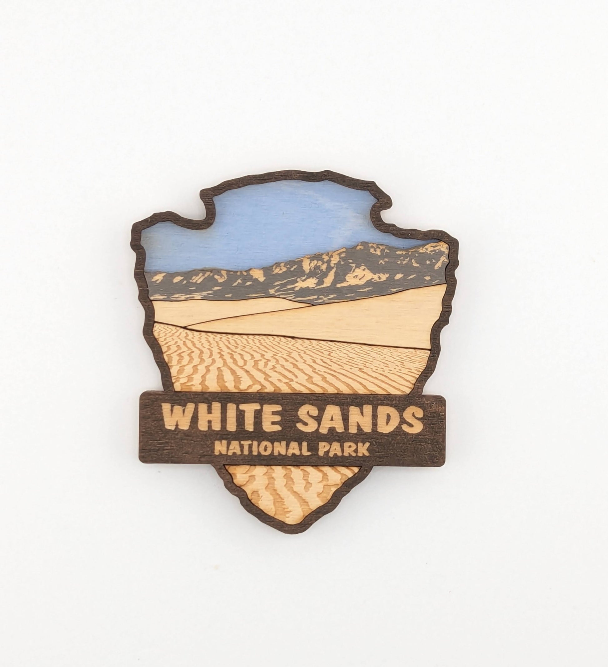 Celebrate your love for the great outdoors with this handcrafted wooden magnet or ornament. Inspired by the classic National Park Arrowhead, its layered design highlights the beauty of nature and brings a touch of the wilderness into your home. Whether displayed on your fridge or hung as décor, it makes a perfect keepsake, gift, or addition to your National Park collection. Each piece is laser-cut and hand-finished, making each item a one-of-a-kind piece of art. Created in our home. From our family to yours. Dimensions: 3.5" tall x 3" wide.